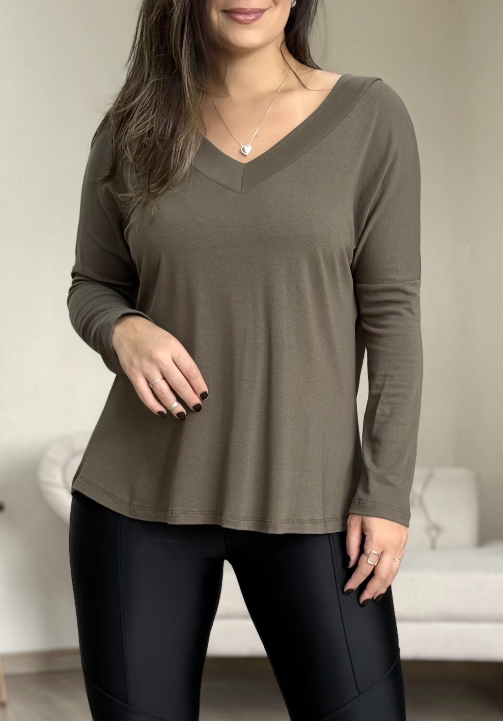 Blusa Daniela - Confeccionada em malha de viscose com elastano, esta blusa apresenta uma modelagem soltinha que garante conforto durante todo o dia. Seu decote em V e mangas longas tornam a peça versátil e elegante para diversas ocasiões.
