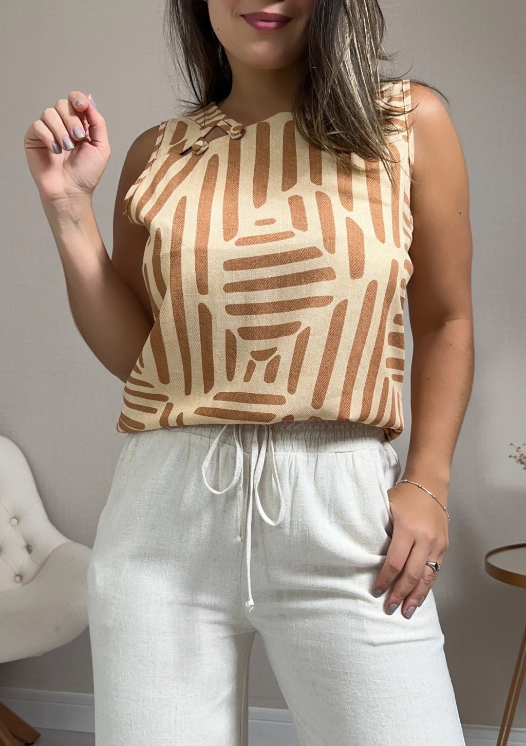 Blusa Samanta - Caramelo e Nude Confeccionada em tecido de viscose, esta blusa possui modelagem regata que proporciona conforto e frescor. O destaque fica por conta do detalhe de abotoamento na lateral do decote e a linda estampa, que adiciona charme e sofisticação à peça. Ideal para compor looks elegantes e versáteis, perfeitos para diversas ocasiões. Aposte na Blusa Samanta para um visual moderno e confortável.