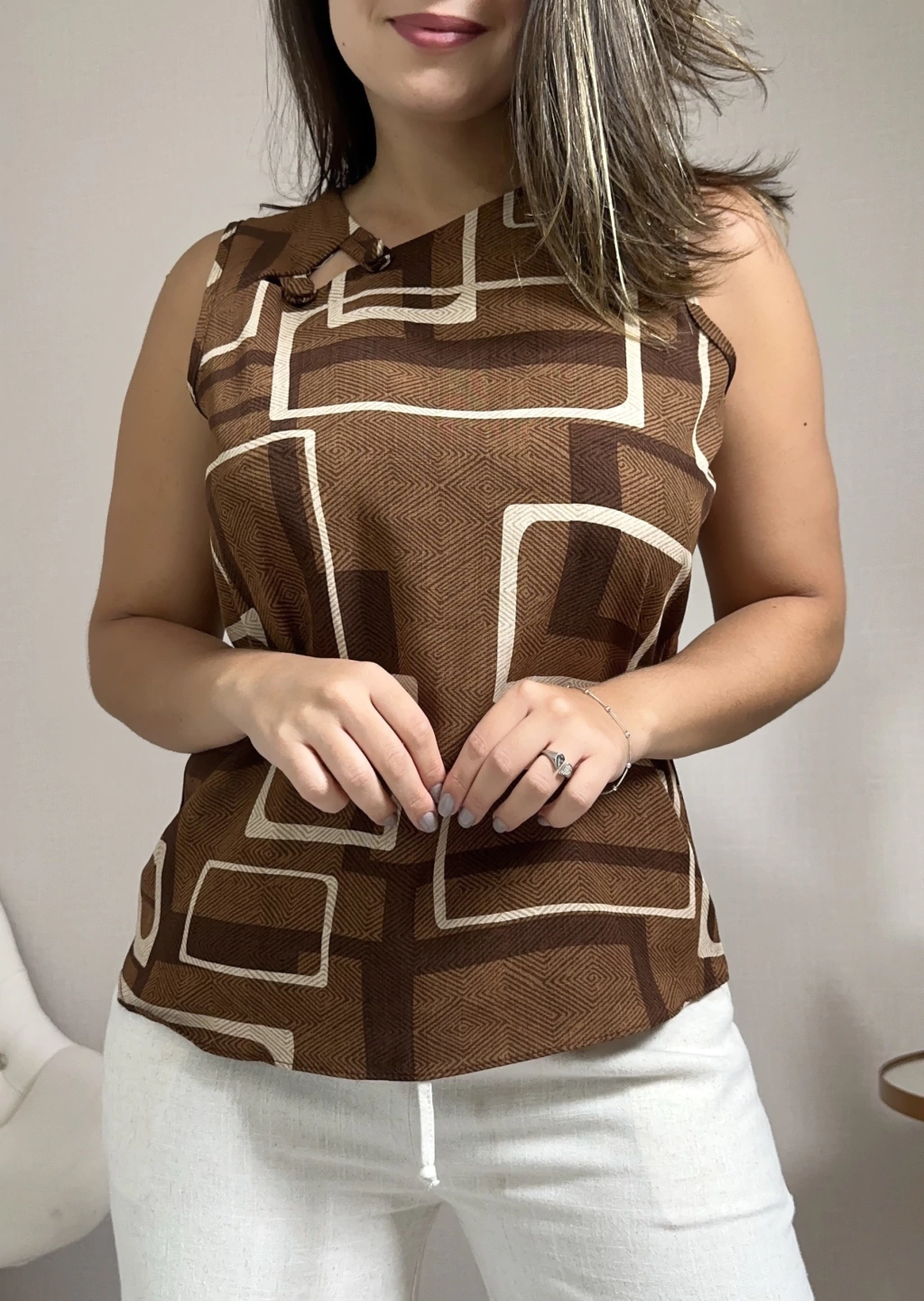 Blusa Samanta - Chocolate e Nude Confeccionada em tecido de viscose, esta blusa possui modelagem regata que proporciona conforto e frescor. O destaque fica por conta do detalhe de abotoamento na lateral do decote e a linda estampa, que adiciona charme e sofisticação à peça. Ideal para compor looks elegantes e versáteis, perfeitos para diversas ocasiões. Aposte na Blusa Samanta para um visual moderno e confortável.