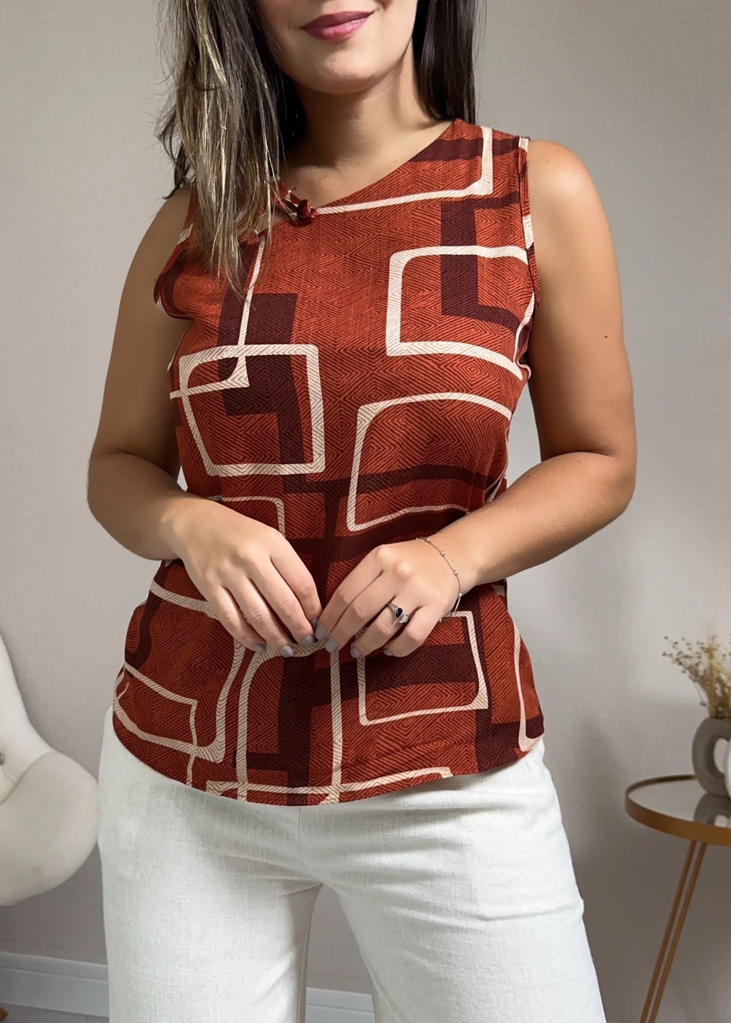 Blusa Samanta - Terracota e Nude Confeccionada em tecido de viscose, esta blusa possui modelagem regata que proporciona conforto e frescor. O destaque fica por conta do detalhe de abotoamento na lateral do decote e a linda estampa, que adiciona charme e sofisticação à peça. Ideal para compor looks elegantes e versáteis, perfeitos para diversas ocasiões. Aposte na Blusa Samanta para um visual moderno e confortável.