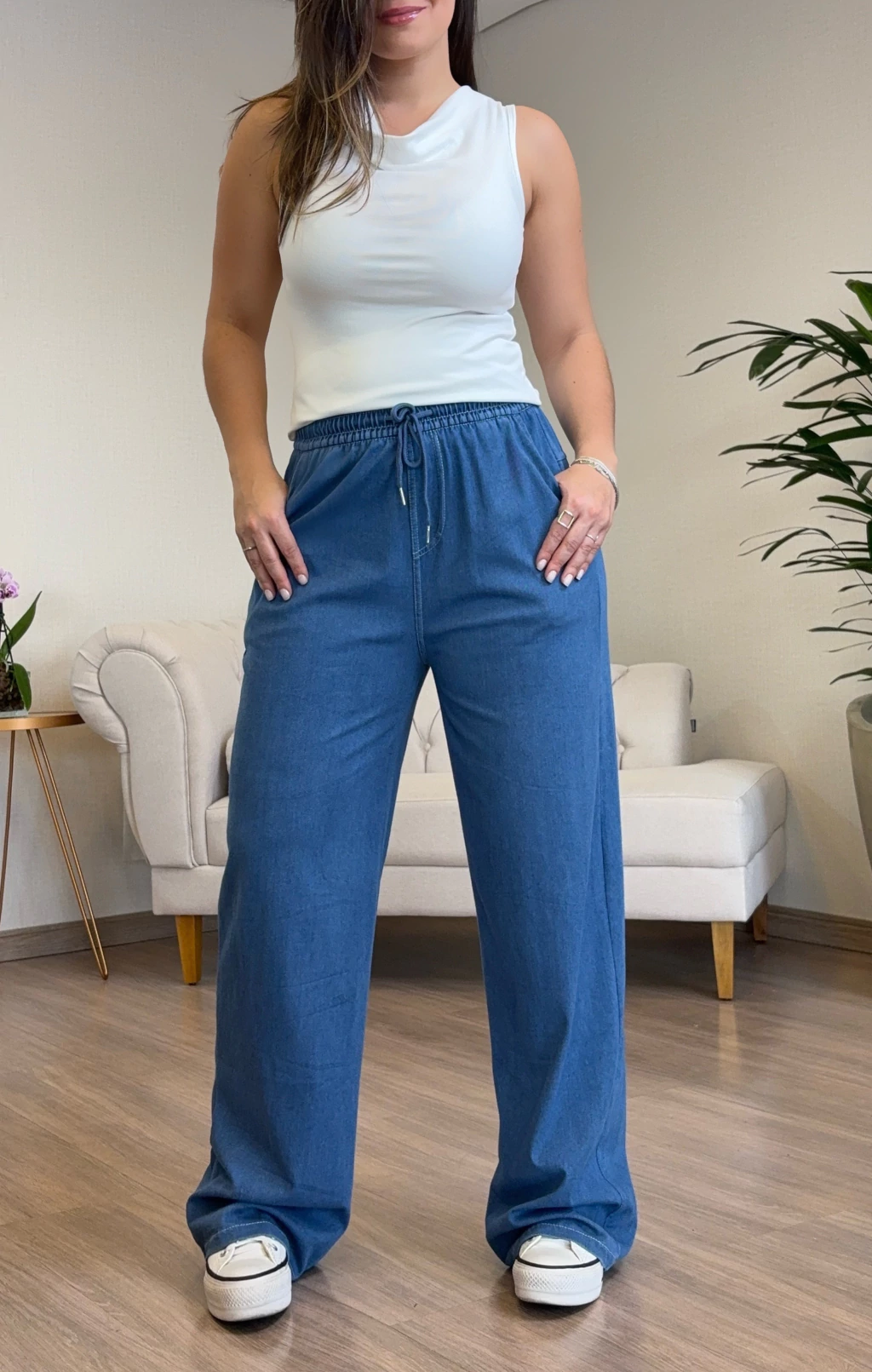 Calça Pantalona Jeans Escuro Confeccionada em tecido jeans com elastano, esta calça pantalona oferece conforto e estilo para o seu dia a dia. A cintura em elástico flexível com amarração garante ajuste perfeito e praticidade. Sua modelagem soltinha proporciona liberdade de movimento, enquanto os bolsos laterais completam o visual funcional. Ideal para quem busca uma peça versátil, confortável e moderna. Experimente e sinta a diferença no seu guarda-roupa!