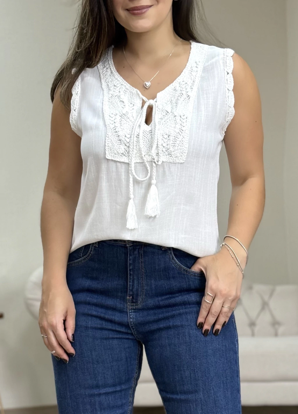 Produzida em viscolinho leve e confortável, esta regata destaca-se pelo delicado detalhe rendado no decote e nas cavas, conferindo um toque feminino e sofisticado. Possui amarração frontal em cordão com ponteira em tessel, que valoriza o visual e permite ajuste personalizado. Ideal para composições frescas e elegantes, perfeita para o clima brasileiro. Cuide bem da sua peça e aproveite o conforto e estilo que a Regata Ísis oferece.
