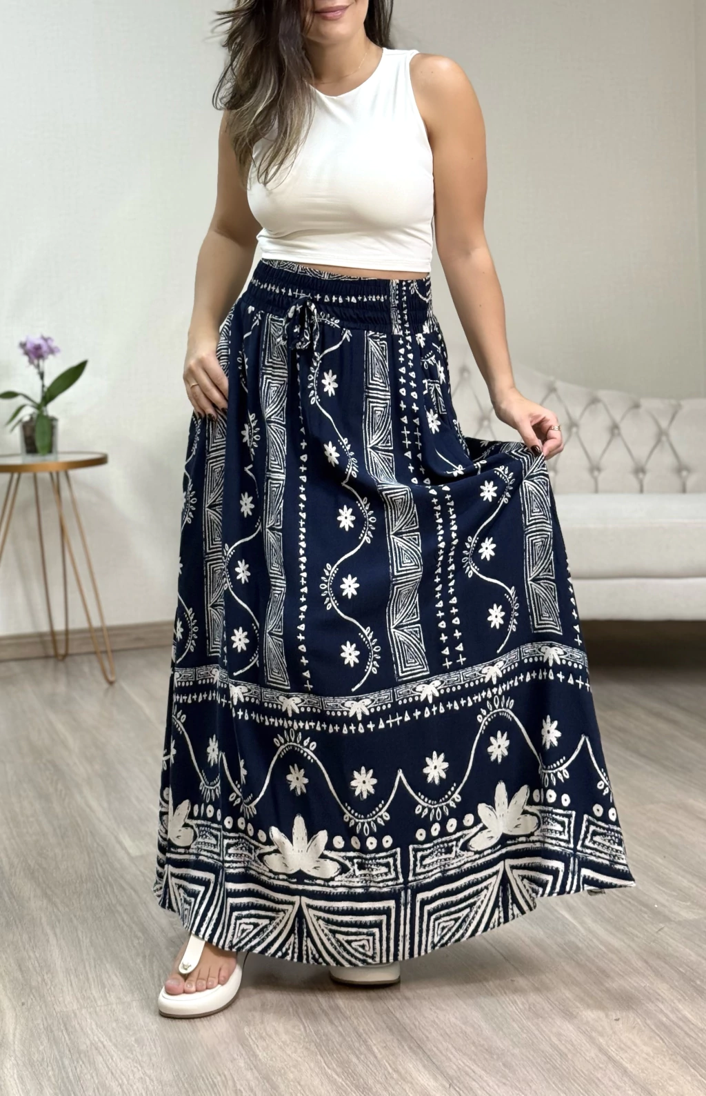 A Saia Séfora é a escolha perfeita para quem busca elegância e conforto. Confeccionada com um cós elástico e amarração fixa, ela se adapta facilmente ao corpo. Seus bolsos laterais e fendas laterais garantem um toque moderno e funcional.
