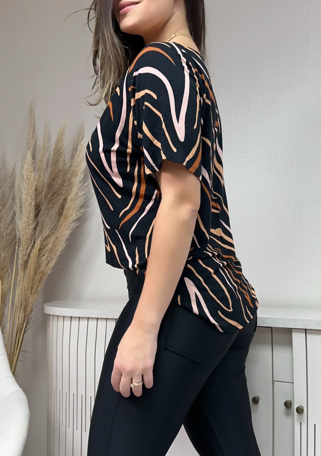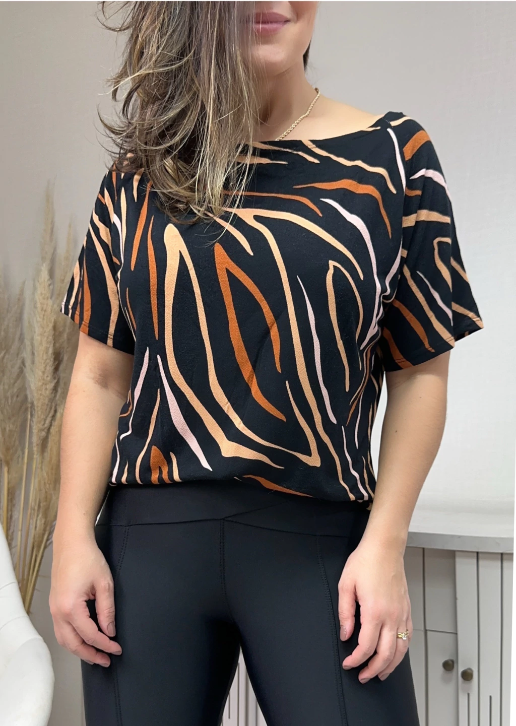 T-shirt produzida em tecido de malha com elastano de toque macio e confortável com linda estampa, possuí gola canoa, manga tipo raglan, comprimento perfeito para usar soltinna ou com nózinho.