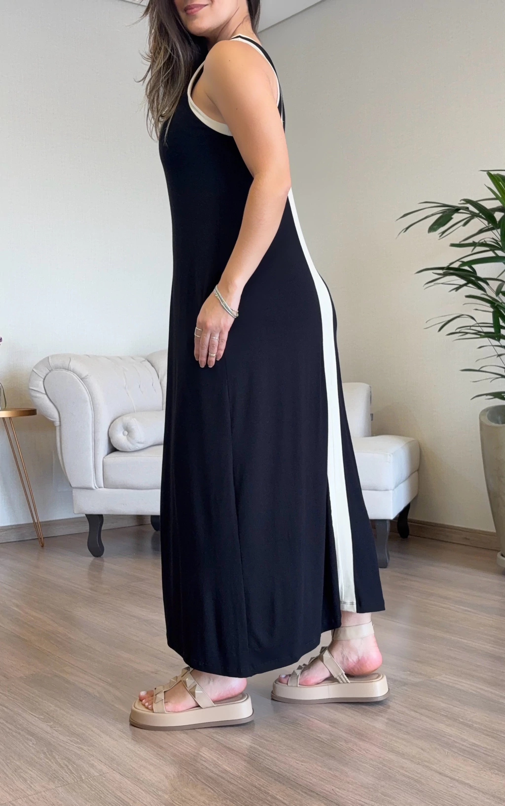 Vestido Cecília - Preto e Nude Confeccionado em malha de viscose com elastano, o Vestido Cecília oferece conforto e caimento perfeito. Sua modelagem midi traz detalhes bicolor em preto e nude, com decote em V frente e costas, bolsos laterais e fenda frontal para um toque elegante.