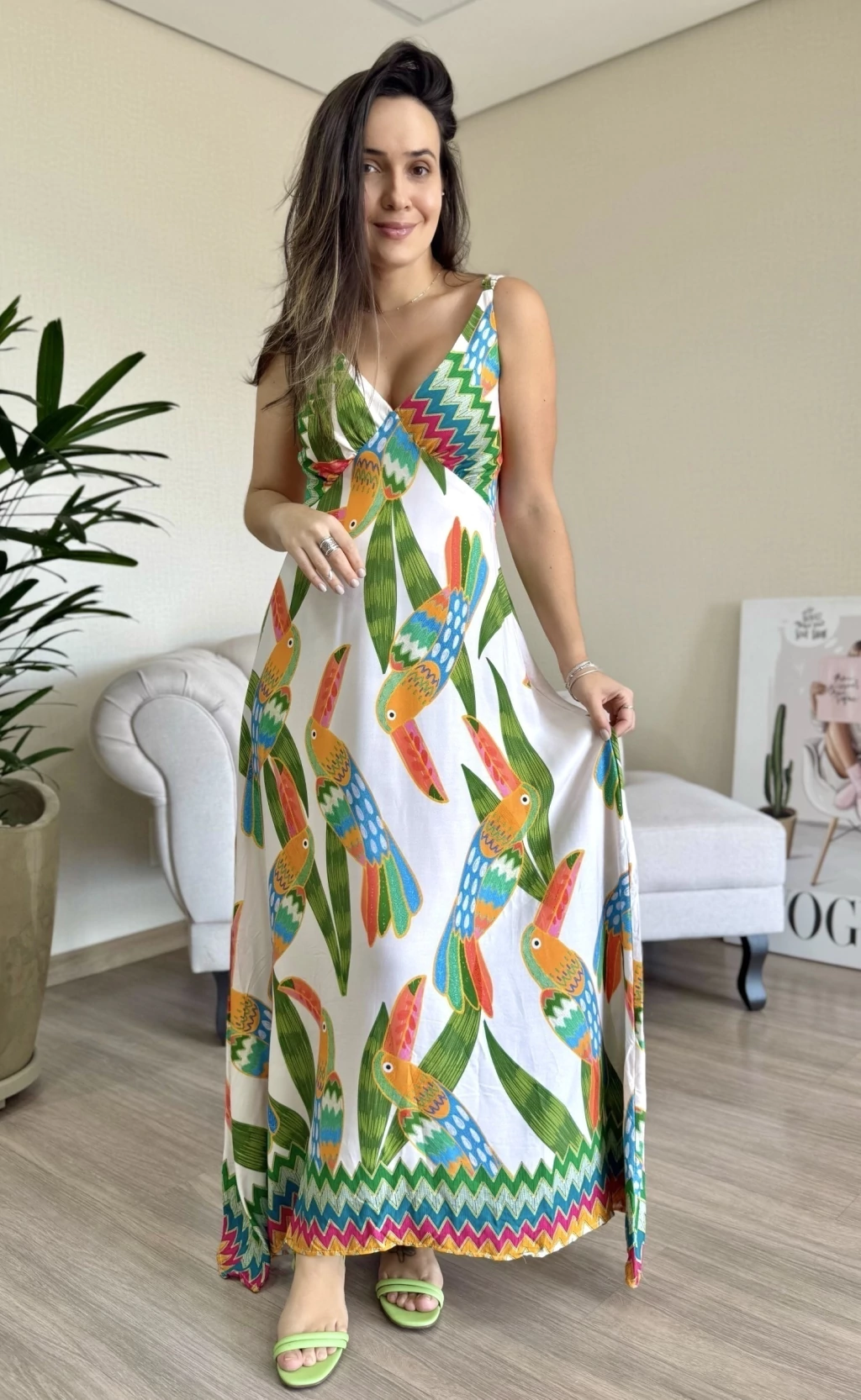 O Vestido Nature é confeccionado em tecido de viscose, garantindo leveza e conforto para os dias quentes. Possui alças com reguladores, que permitem ajuste perfeito ao corpo. Sua modelagem evasê valoriza a silhueta, enquanto a estampa tropical de tucanos coloridos traz um toque vibrante e exclusivo.