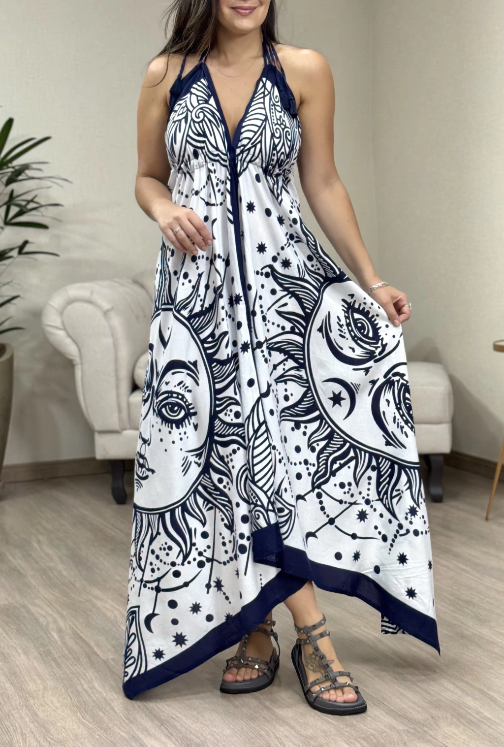 Vestido Saída Solar – perfeito para o verão com estilo e conforto. Produzido em tecido de viscose, este vestido / saída de modelagem ampla garante frescor e leveza. Possui amarração que ajusta o busto, proporcionando um caimento perfeito, além de costa cavada que valoriza a silhueta. A linda estampa mística adiciona um toque único, ideal para usar como vestido ou saída de praia. Aposte nessa peça versátil para arrasar nos dias quentes!